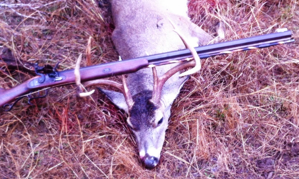 A nice Hill Country 8 point taken by Tom Compton in far West Travis County Saturday. It had an 18″ outside spread, taken with a .54 flintlock Tom built. The load was a .535 lead ball patched w/ .024 denim and lubed w/ mink oil. Powered by a 90gr charge of Goex FFg Blackpowder.Â