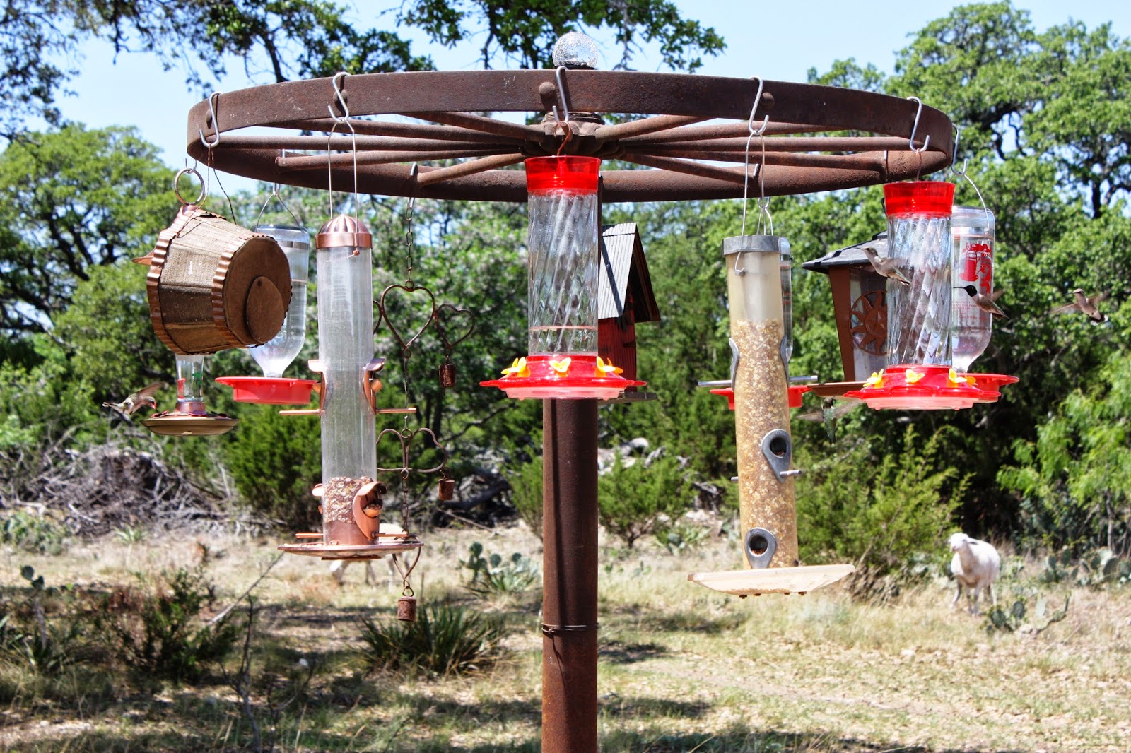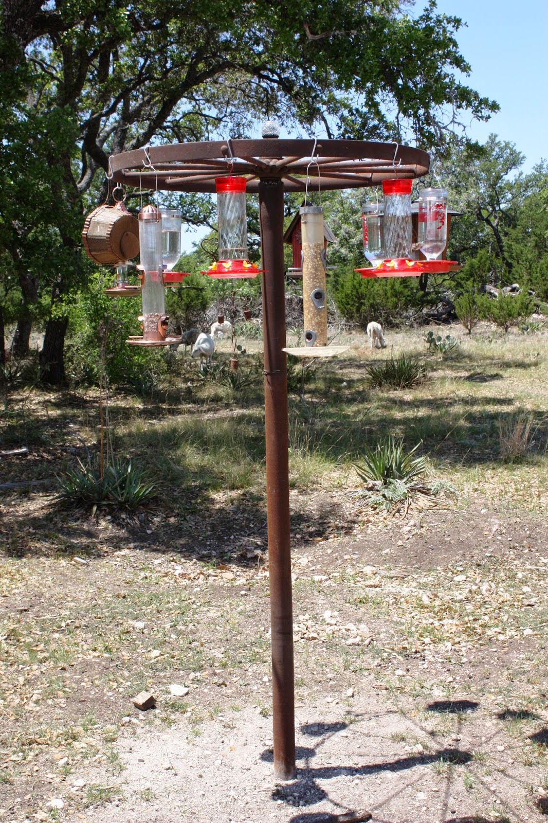 My wife and I have fed hummingbirds most of our adult lives. We so enjoy just sitting and watching the antics of the little birds that hover like helicopters and then zoom around like jet fighters sometimes so close to our eyes as to make us uncomfortable. The twirling fights of the different males along with the vibrant colors of some of the species can draw one to watch them for hours. When we moved to WildWoods we wanted to have a special area for the hummers and kept trying to figure out a way to hang our feeders. We tried hooks on trees, shepherd hooks and other contraptions that would get knocked over by the livestock or just were too hard to refill the feeders. We finally came up with the idea of taking an old steel farm implement wheel and mounting it on a post to make a carousel upon which feeders and bird houses could be hung. I took some 2 7/8 steel pipe scraps that we were using for fence posts and braces, welded them together and set it in the ground. I then welded the old steel wheel to the pipe and it has worked great as a holder for feeders and bird houses. Come up with your own ideas and see what you can do for the birds, Wild Ed